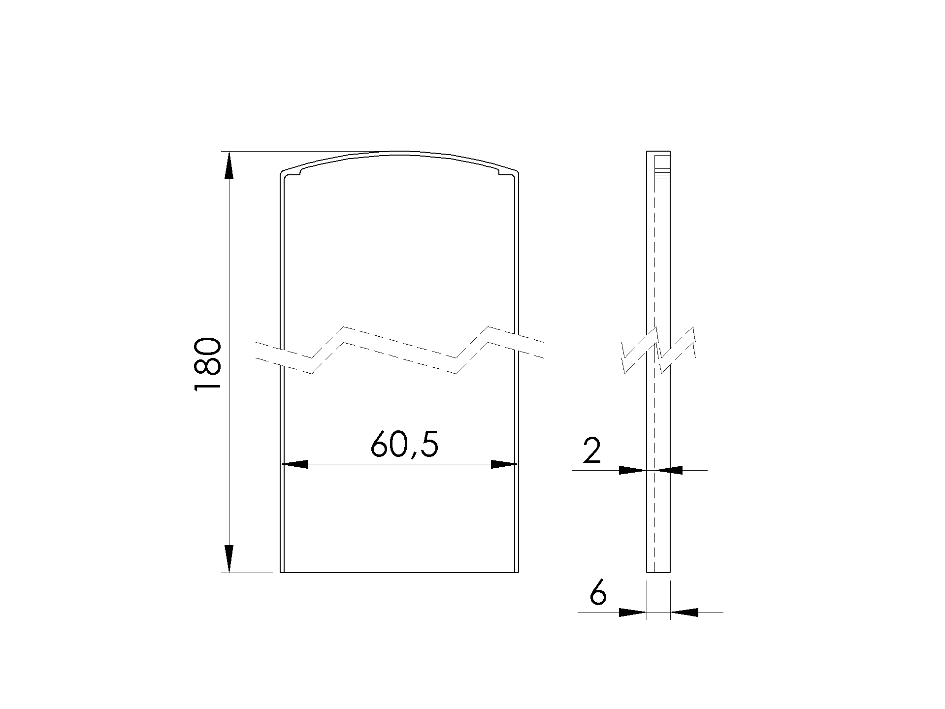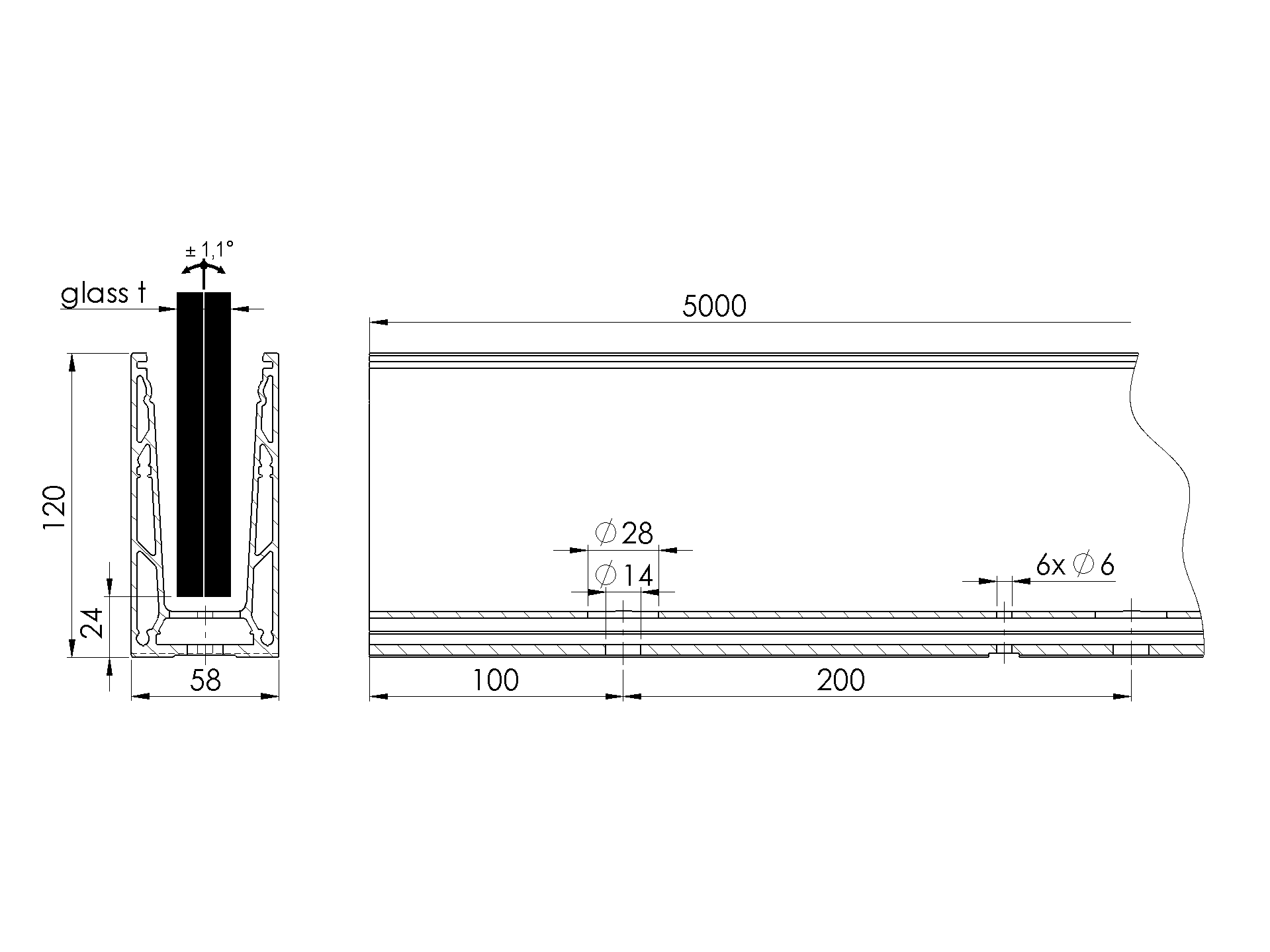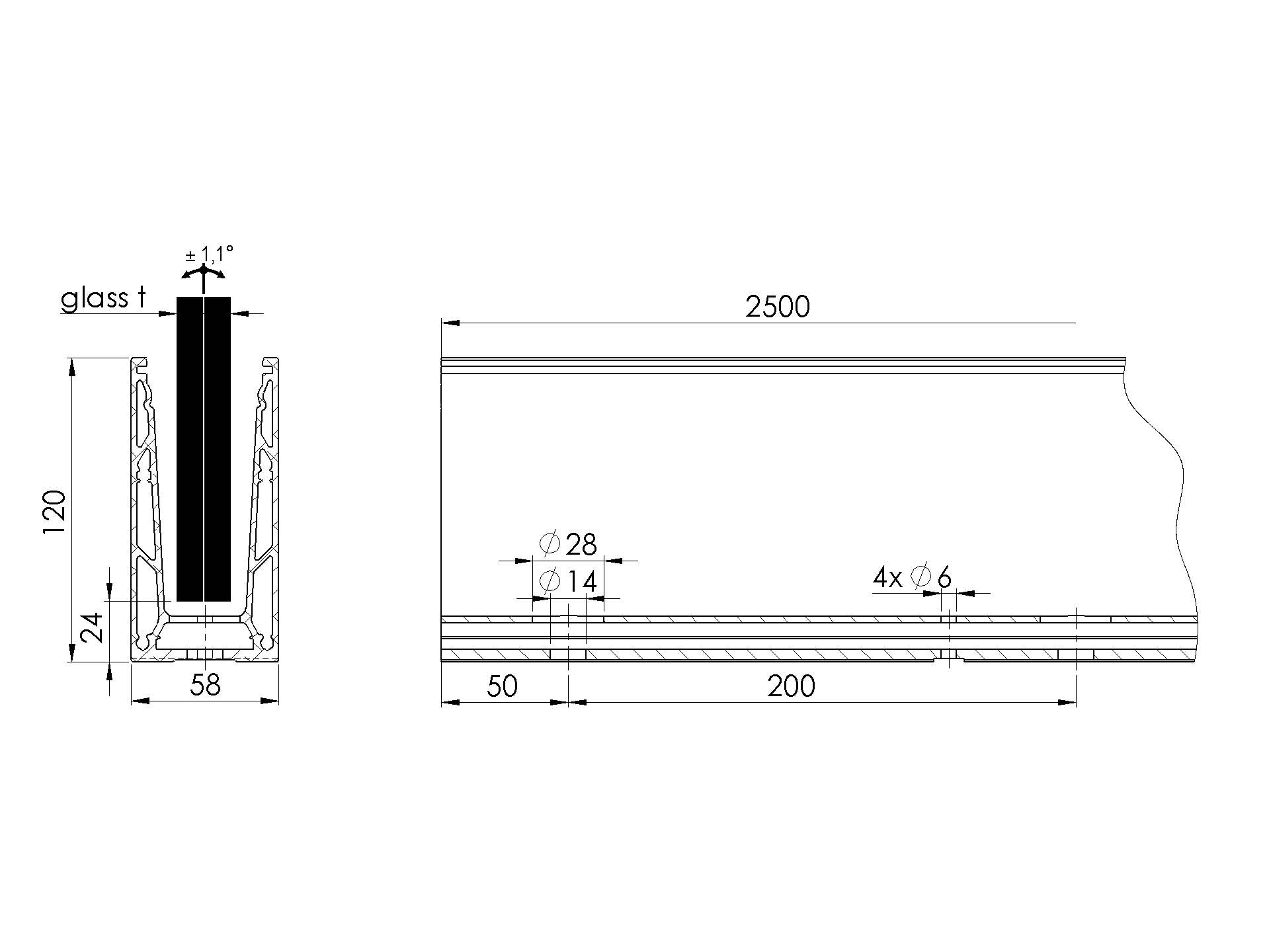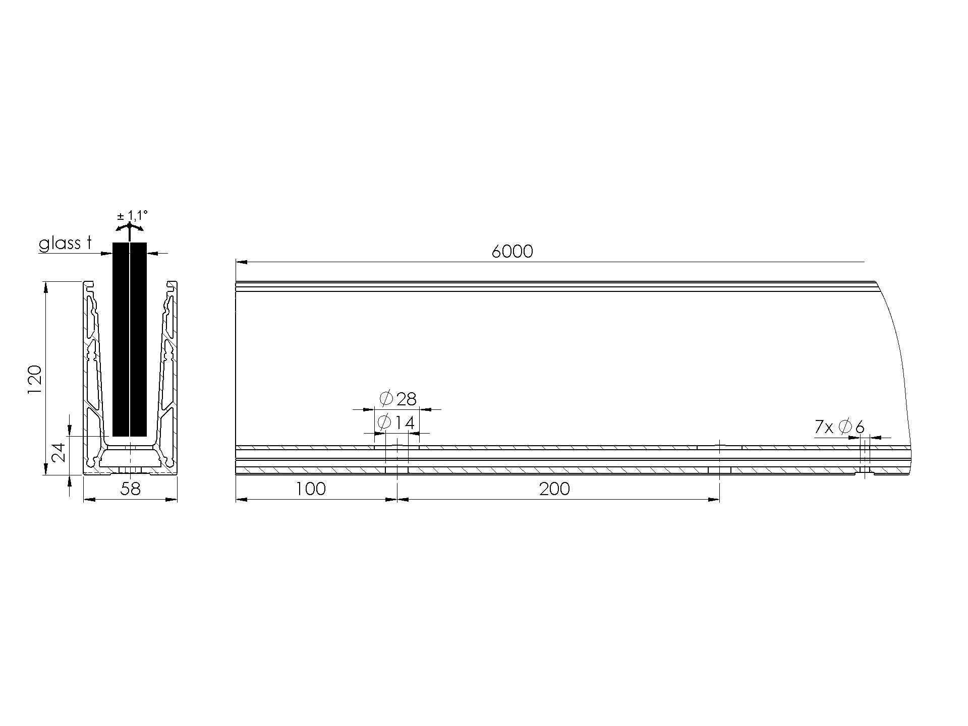 Al. anchoring profile ELOX 120/57mm for glass T=12 to 17.52mm, anchoring from top to floor, adjustable glass inclination. Supplied in lengths L2500mm (13 pcs of holes d14mm for anchoring). Supplied without seals. Surface treatment ELOX - brushed.