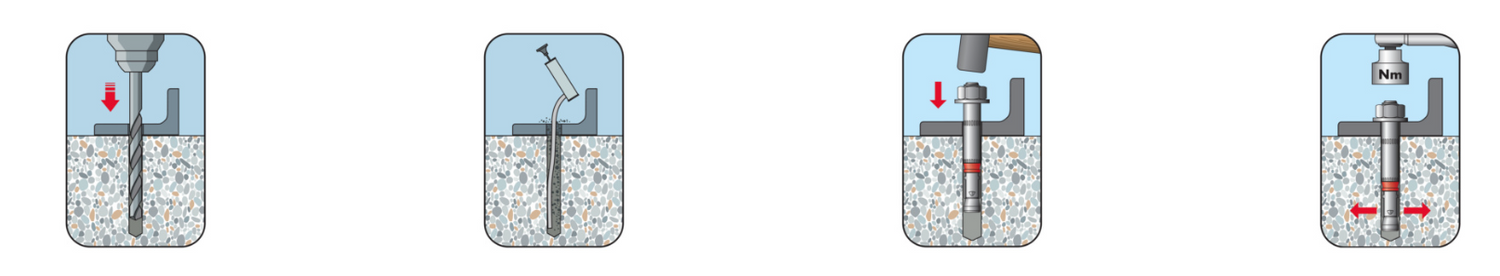 When tightening the screw, the expansion cone is drawn into the body of the anchor and stops it against the wall of the drilled hole. The red plastic ring prevents the spacer part from rotating and absorbs the displacement of the anchor during tightening. This means that the anchored object is attracted to the anchoring base.