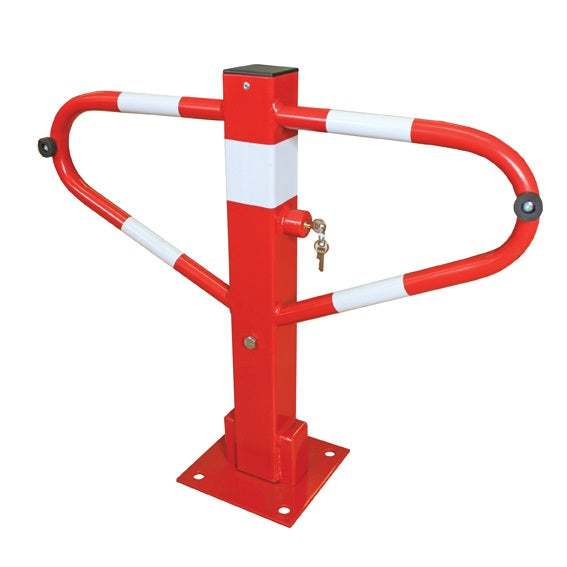 Manual parking space barrier, made of steel tube, powder coated with red reflective paint, additionally marked with white reflective stickers.