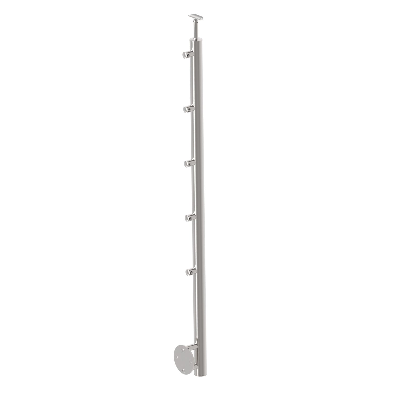 Stainless steel post D42.4 mm for handrail D42.4 mm. Side anchoring, horizontal infill 5 x d12 mm. Designed for stair railings 100 cm high, for installation with a max. drop of up to 12 m. Possibility of adjusting the inclination of the infill and handrail.