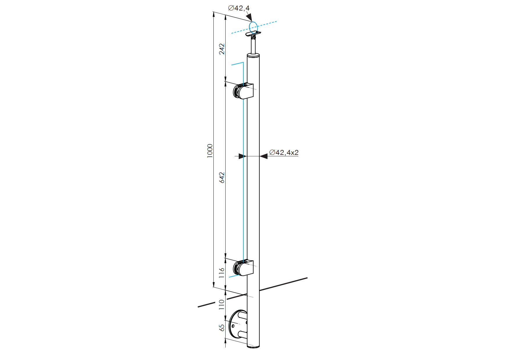 1 pcsMaterialStainless steel AISI 304Surface finishSatinedPostD42,4x2Required productsGlass clamp A/2200-042