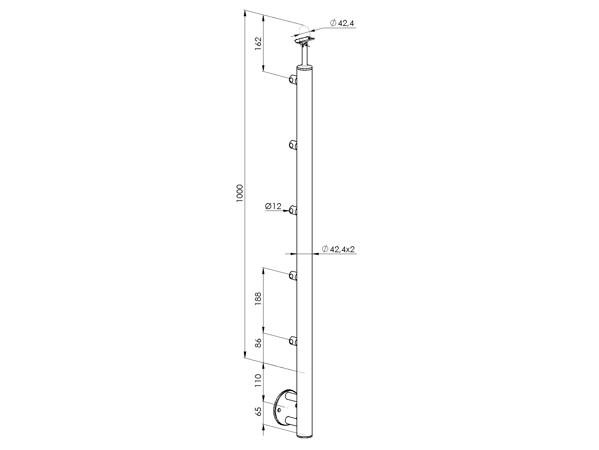 Stainless steel post D42.4 mm for handrail D42.4 mm, side anchoring. Horizontal infill 5 x d12 mm. Designed for straight railings 100 cm high, for installation with a max. overhang of up to 12 m. Possibility of adjusting the inclination of the infill and handrail.