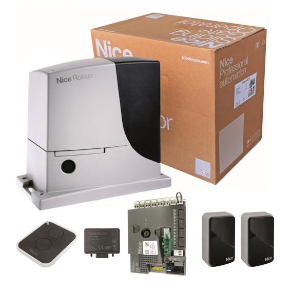 Mark: Nice, Max. wing length: 12m, Module of the gear comb: mod 4, Recommended weight of the wing: 500kg, Frequency (MHz): 433, Code type: Rolling, Parts of the set: RB1000-1x, RBA3R10-1x, OXI-1x, ON2E-1x, EPMB-1pár, Drive slowdown: Drive decelerate before endpoint, Motor power supply: DC 24V, Performance: 450W, Force: 900N, Speed: 0,28 m/s, Power supply: AC 230V, Controller: RBA3R10, Master/Slave: Áno, Protection level: IP44